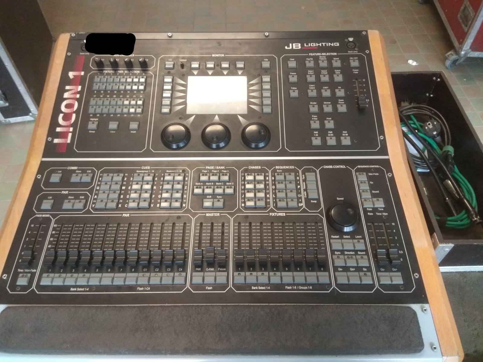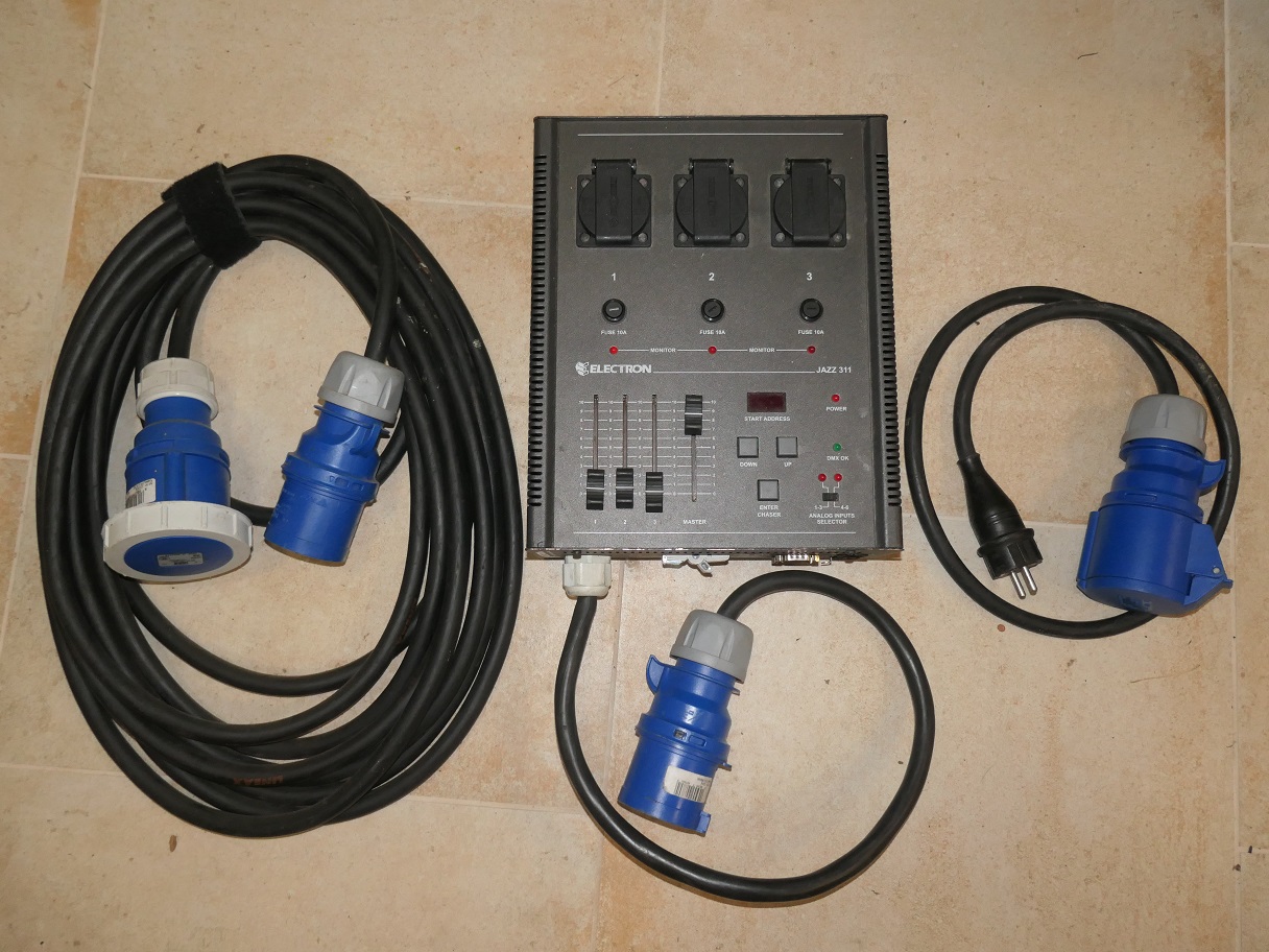 Nabízím tříkanálový DMX stmívač Elektron o výkonu 3x 10A. Je osazen klasickými zásuvkami se zemnícím kolíkem používanými v CZ, má možnost ovládání jednotlivých kanálů pomocí fater, automatické chase programy. Odjištěno přímo na dimeru jističem C30A, připojení modrým průmyslovým 32A tří kolíkem CEE. Součástí je i přechodka na klasickou 16A zásuvku + kabel Titane 3x6mm délky 10m taktéž osazen modrým tří kolíkem 32A. Naprosto spolehlivá profesionální technika made in EU. Plně funkční v perfektním stavu s minimálními známkami používání.
