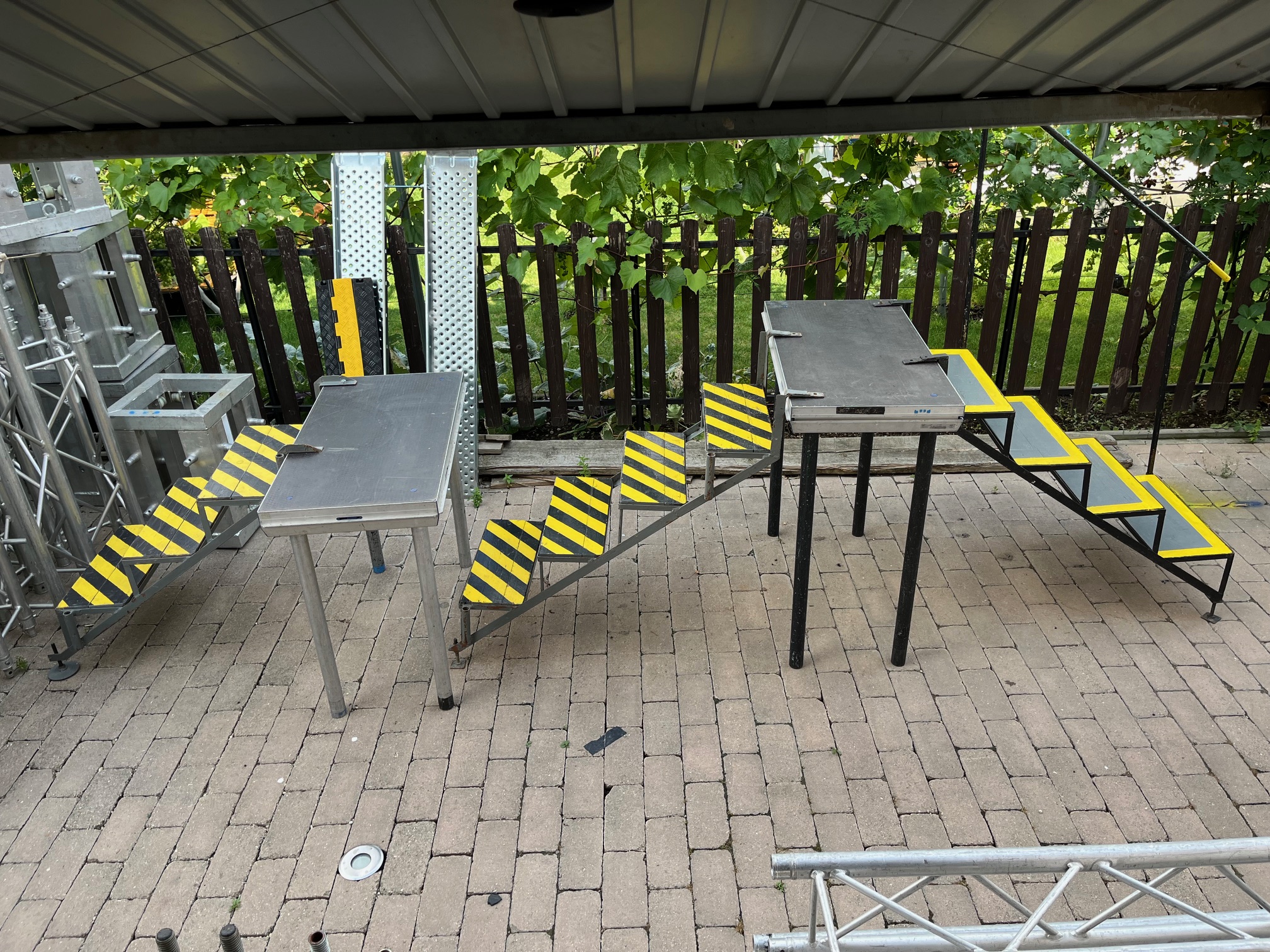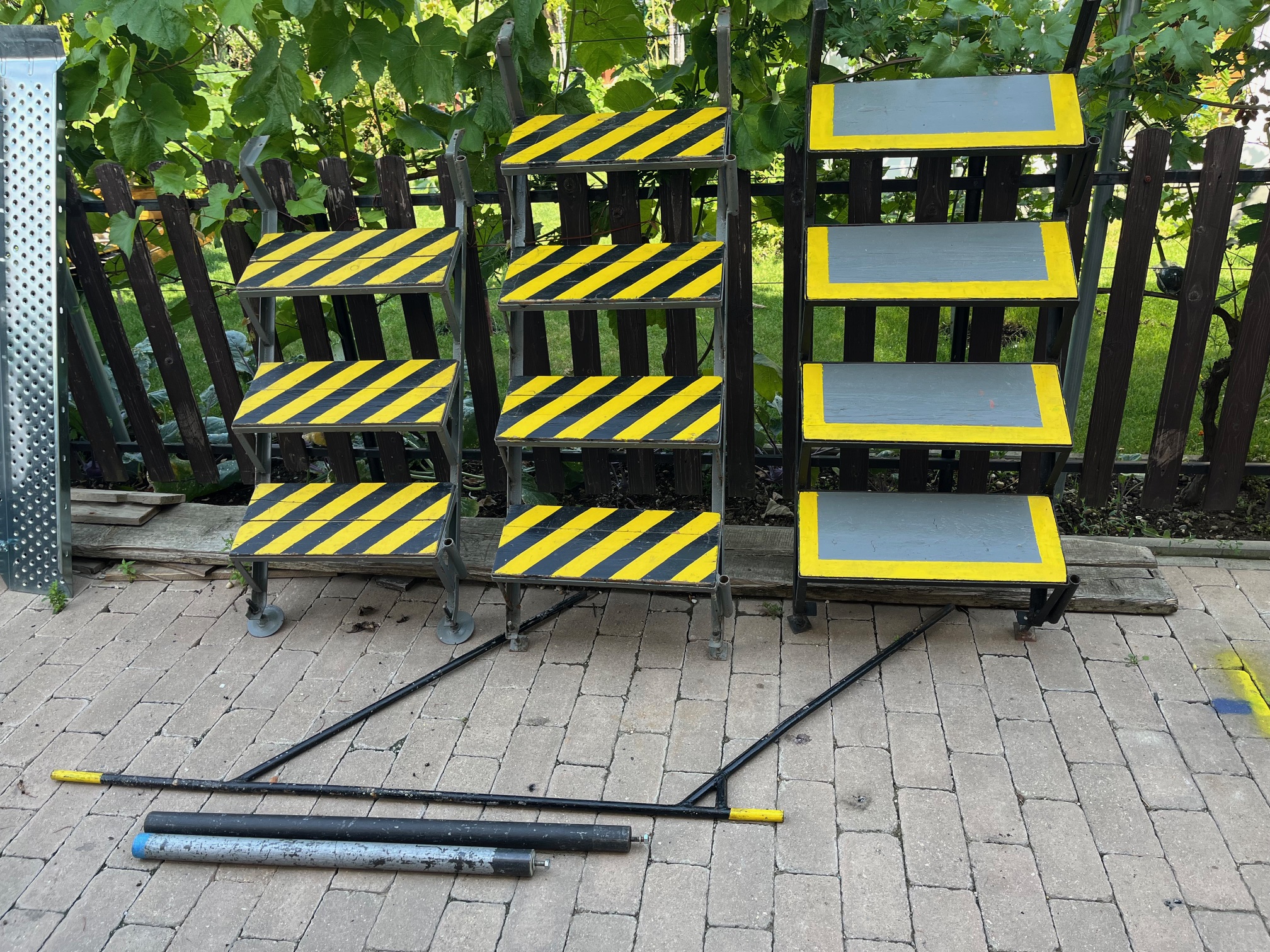 Predám schody k pódiu, 2ks 4- stupňové na výšku pódia 1m, 1ks 3- stupňové na výšku pódia 80cm, všetky ešte majú dole nastavovacie skrutky na presné nastavenie výšky,